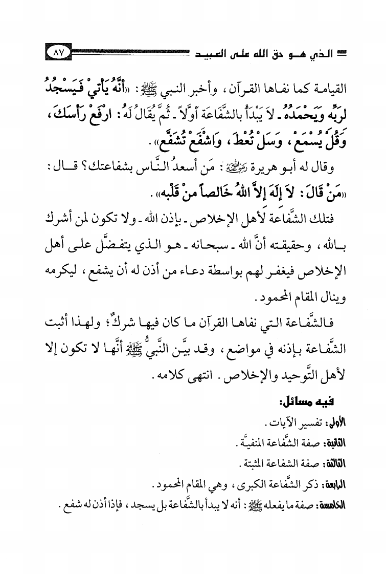نام کتاب : الأصول الثلاثة وشروط الصلاة والقواعد الأربع وكتاب التوحيد وكشف الشبهات والواجبات المتحتمات والأربعون النووية نویسنده : محمد بن عبد الوهاب جلد : 1 صفحه : 87