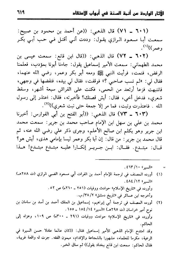 نام کتاب : الآثار الواردة عن أئمة السنة في أبواب الإعتقاد كتاب سير أعلام النبلاء للإمام الذهبي جمعاً وتخريجاً ودراسة نویسنده : جمال بن أحمد بن بشيربادي جلد : 1 صفحه : 619