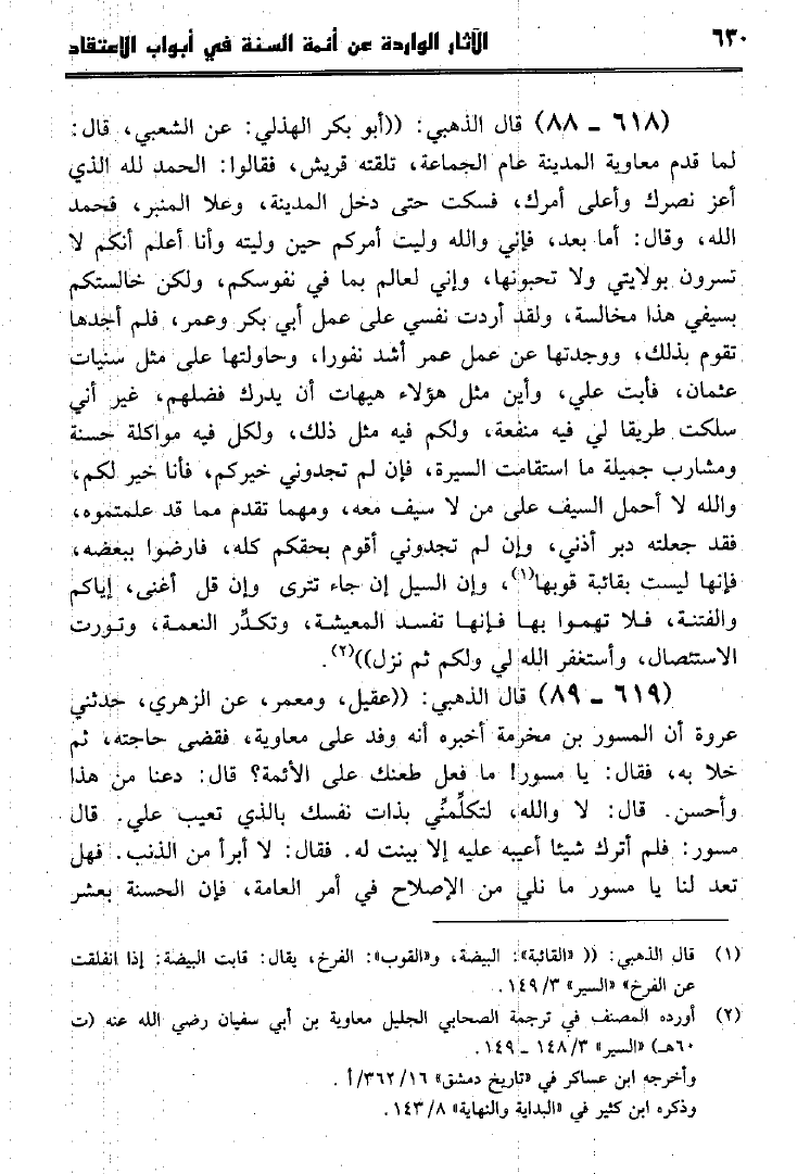 نام کتاب : الآثار الواردة عن أئمة السنة في أبواب الإعتقاد كتاب سير أعلام النبلاء للإمام الذهبي جمعاً وتخريجاً ودراسة نویسنده : جمال بن أحمد بن بشيربادي جلد : 1 صفحه : 630
