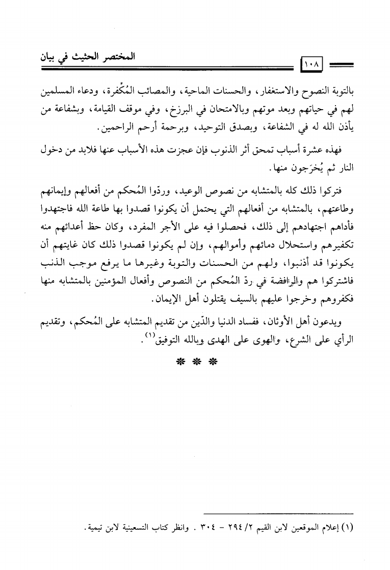 نام کتاب : المختصر الحثيث في بيان أصول منهج السلف أصحاب الحديث في تلقي الدين وفهمه والعمل به والدعوة إليه نویسنده : عيسى مال الله فرج جلد : 1 صفحه : 108