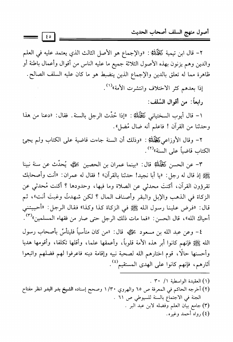 نام کتاب : المختصر الحثيث في بيان أصول منهج السلف أصحاب الحديث في تلقي الدين وفهمه والعمل به والدعوة إليه نویسنده : عيسى مال الله فرج جلد : 1 صفحه : 45