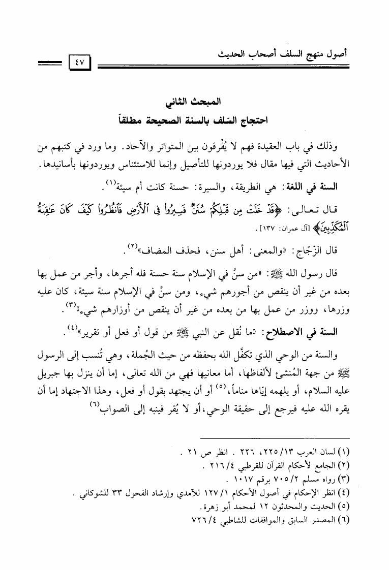نام کتاب : المختصر الحثيث في بيان أصول منهج السلف أصحاب الحديث في تلقي الدين وفهمه والعمل به والدعوة إليه نویسنده : عيسى مال الله فرج جلد : 1 صفحه : 47