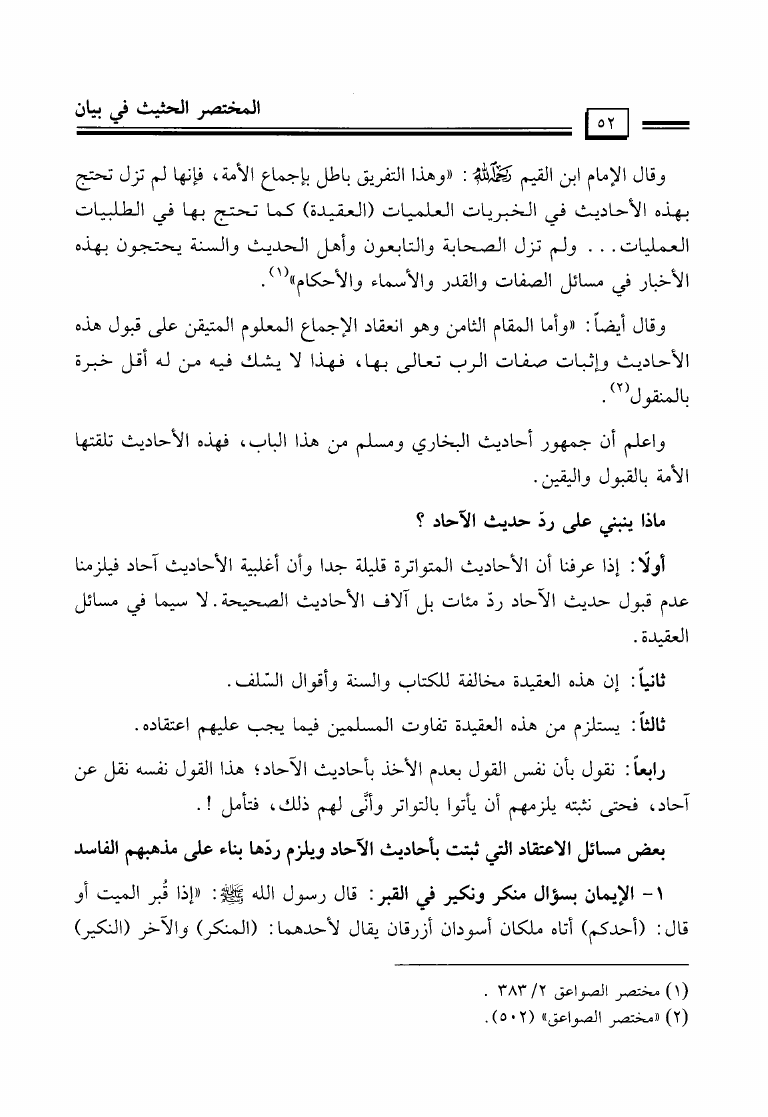 نام کتاب : المختصر الحثيث في بيان أصول منهج السلف أصحاب الحديث في تلقي الدين وفهمه والعمل به والدعوة إليه نویسنده : عيسى مال الله فرج جلد : 1 صفحه : 52
