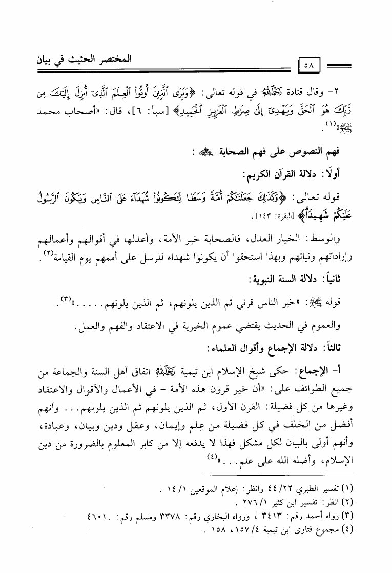 نام کتاب : المختصر الحثيث في بيان أصول منهج السلف أصحاب الحديث في تلقي الدين وفهمه والعمل به والدعوة إليه نویسنده : عيسى مال الله فرج جلد : 1 صفحه : 58
