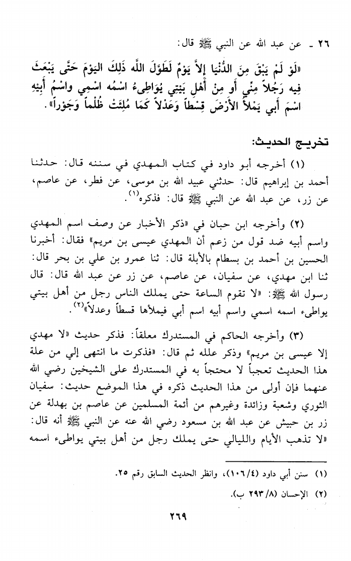 نام کتاب : المهدي المنتظر في ضوء الأحاديث والآثار الصحيحة وأقوال العلماء وآراء الفرق المختلفة نویسنده : عبد العليم عبد العظيم البستوي جلد : 1 صفحه : 269