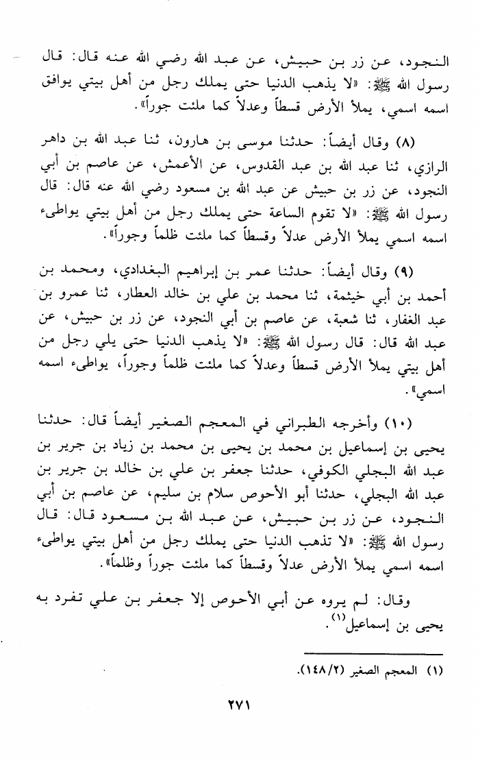 نام کتاب : المهدي المنتظر في ضوء الأحاديث والآثار الصحيحة وأقوال العلماء وآراء الفرق المختلفة نویسنده : عبد العليم عبد العظيم البستوي جلد : 1 صفحه : 271