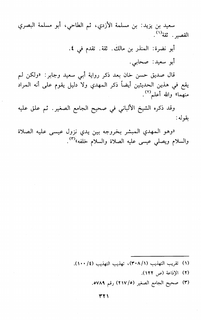 نام کتاب : المهدي المنتظر في ضوء الأحاديث والآثار الصحيحة وأقوال العلماء وآراء الفرق المختلفة نویسنده : عبد العليم عبد العظيم البستوي جلد : 1 صفحه : 321