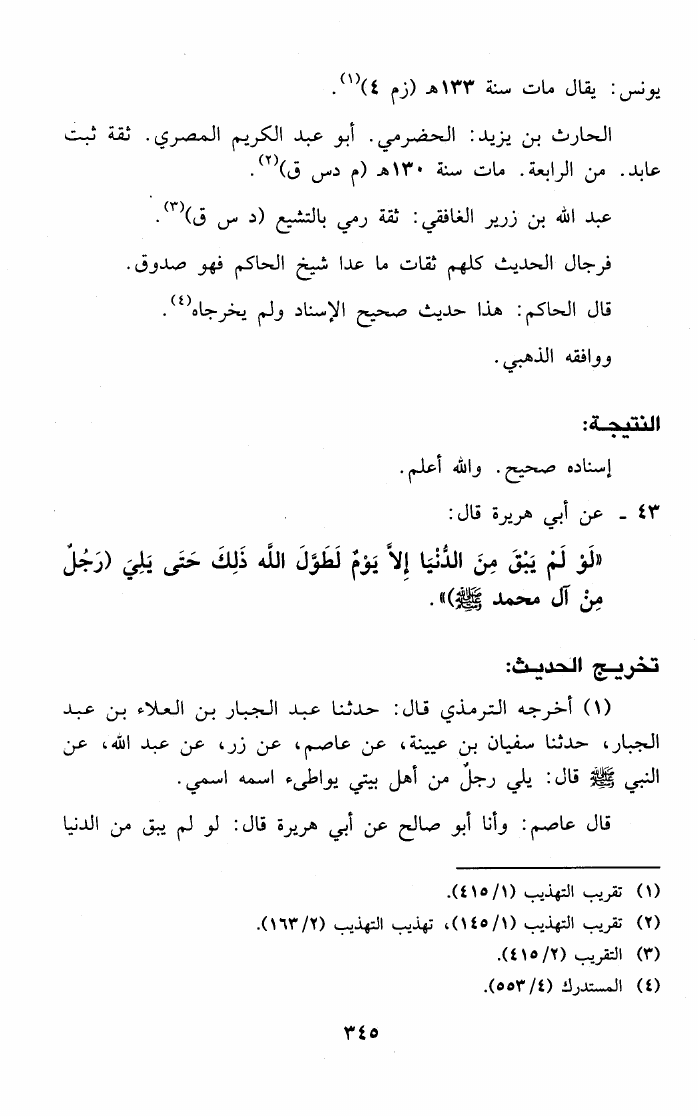 نام کتاب : المهدي المنتظر في ضوء الأحاديث والآثار الصحيحة وأقوال العلماء وآراء الفرق المختلفة نویسنده : عبد العليم عبد العظيم البستوي جلد : 1 صفحه : 345