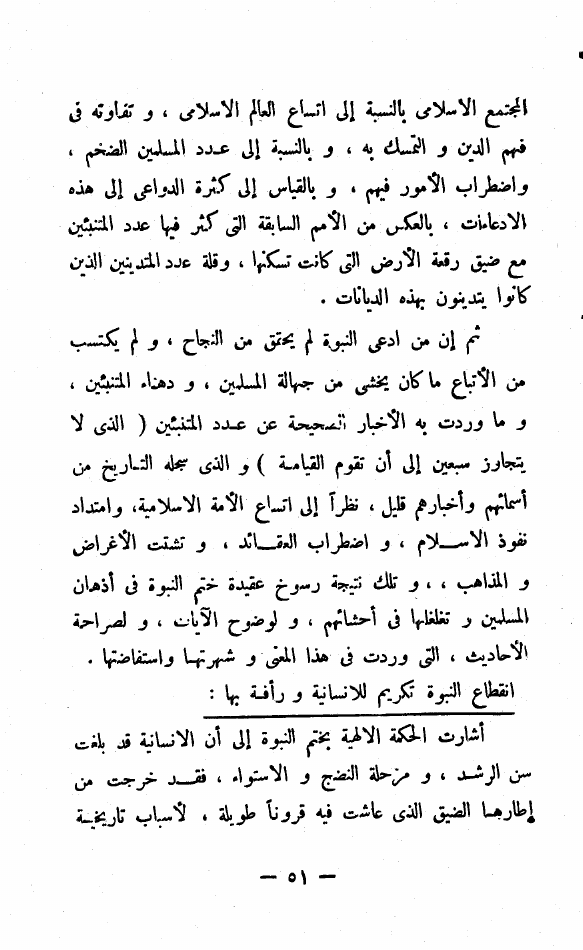 نام کتاب : النبي الخاتم بحث علمي ودراسة تحليلية في إختتام النبوة وإنقطاعها بعد محمد صلى الله عليه وسلم في ضوء الكتاب والسنة وتاريخ الديانات وفلسفة الإجتماع نویسنده : أبو الحسن علي الحسني الندوي جلد : 1 صفحه : 51