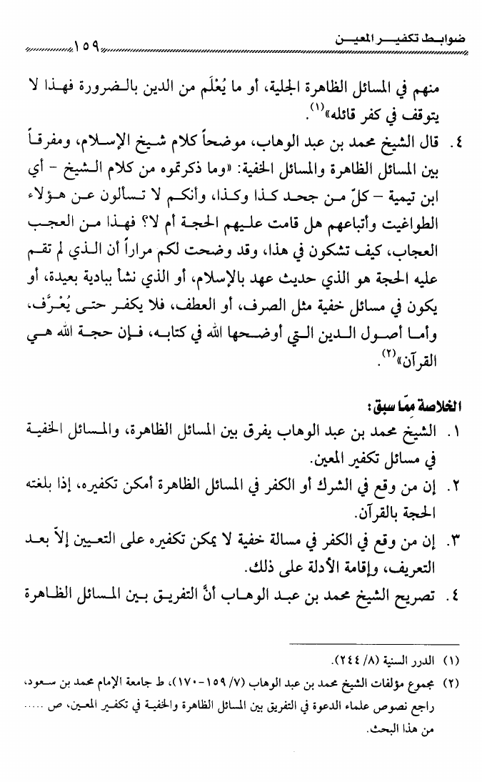 نام کتاب : ضوابط تكفير المعين عند شيخي الإسلام ابن تيمية وابن عبد الوهاب وعلماء الدعوة الإصلاحية نویسنده : راشد بن أبي العلا الراشد أبو العلا جلد : 1 صفحه : 159