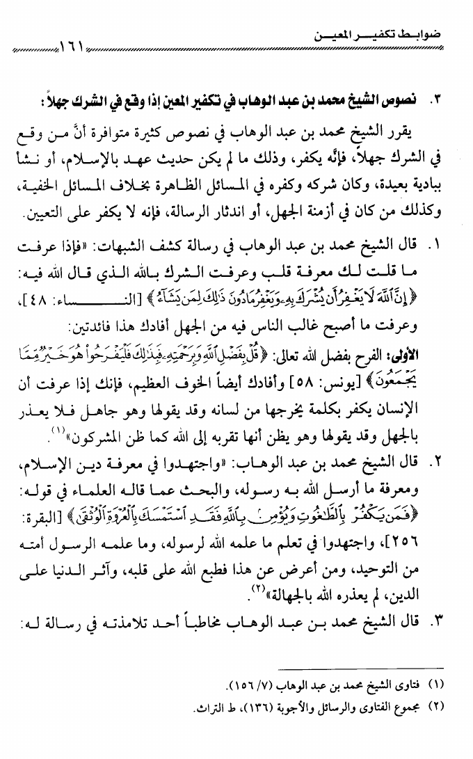 نام کتاب : ضوابط تكفير المعين عند شيخي الإسلام ابن تيمية وابن عبد الوهاب وعلماء الدعوة الإصلاحية نویسنده : راشد بن أبي العلا الراشد أبو العلا جلد : 1 صفحه : 161