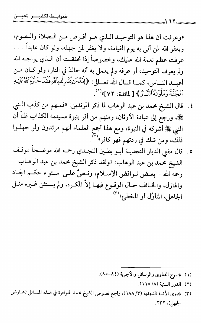 نام کتاب : ضوابط تكفير المعين عند شيخي الإسلام ابن تيمية وابن عبد الوهاب وعلماء الدعوة الإصلاحية نویسنده : راشد بن أبي العلا الراشد أبو العلا جلد : 1 صفحه : 162