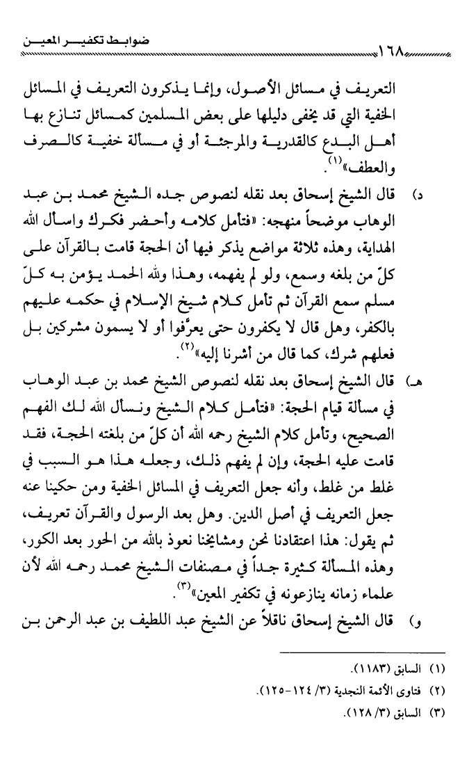 نام کتاب : ضوابط تكفير المعين عند شيخي الإسلام ابن تيمية وابن عبد الوهاب وعلماء الدعوة الإصلاحية نویسنده : راشد بن أبي العلا الراشد أبو العلا جلد : 1 صفحه : 168
