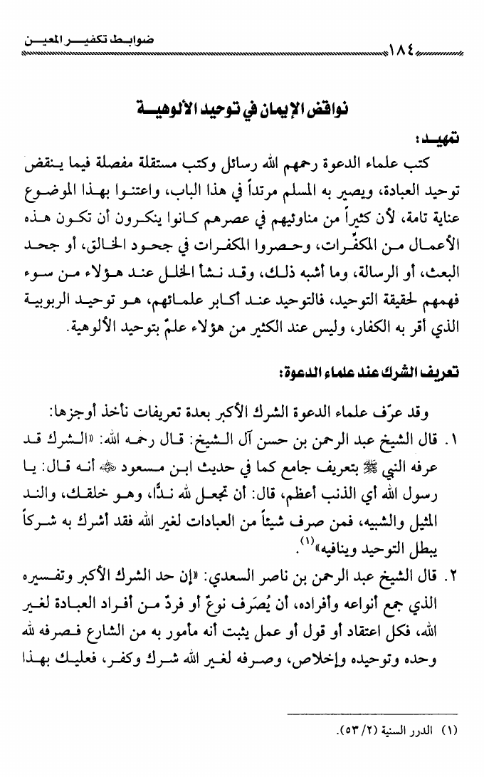 نام کتاب : ضوابط تكفير المعين عند شيخي الإسلام ابن تيمية وابن عبد الوهاب وعلماء الدعوة الإصلاحية نویسنده : راشد بن أبي العلا الراشد أبو العلا جلد : 1 صفحه : 184