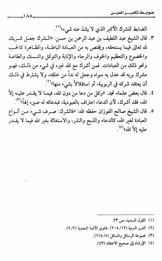 نام کتاب : ضوابط تكفير المعين عند شيخي الإسلام ابن تيمية وابن عبد الوهاب وعلماء الدعوة الإصلاحية نویسنده : راشد بن أبي العلا الراشد أبو العلا جلد : 1 صفحه : 185