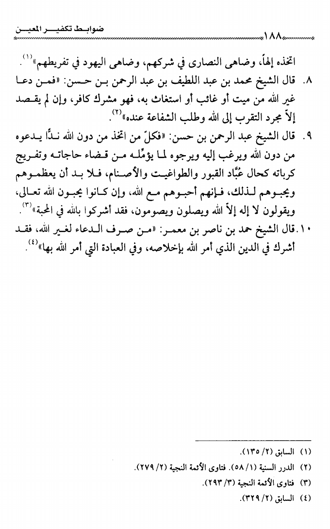 نام کتاب : ضوابط تكفير المعين عند شيخي الإسلام ابن تيمية وابن عبد الوهاب وعلماء الدعوة الإصلاحية نویسنده : راشد بن أبي العلا الراشد أبو العلا جلد : 1 صفحه : 188