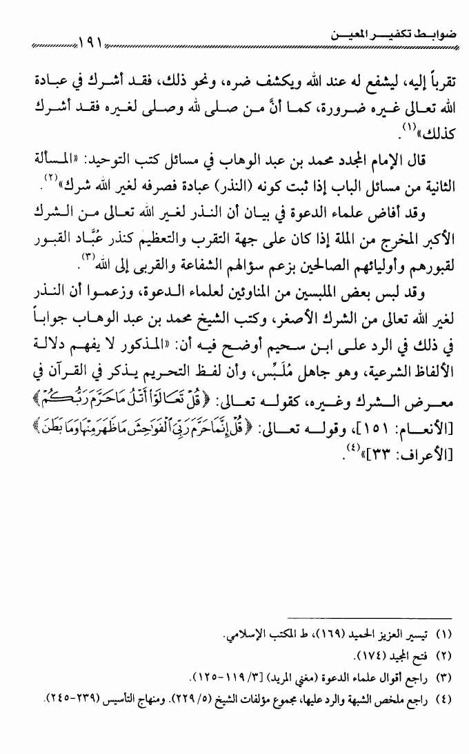 نام کتاب : ضوابط تكفير المعين عند شيخي الإسلام ابن تيمية وابن عبد الوهاب وعلماء الدعوة الإصلاحية نویسنده : راشد بن أبي العلا الراشد أبو العلا جلد : 1 صفحه : 191