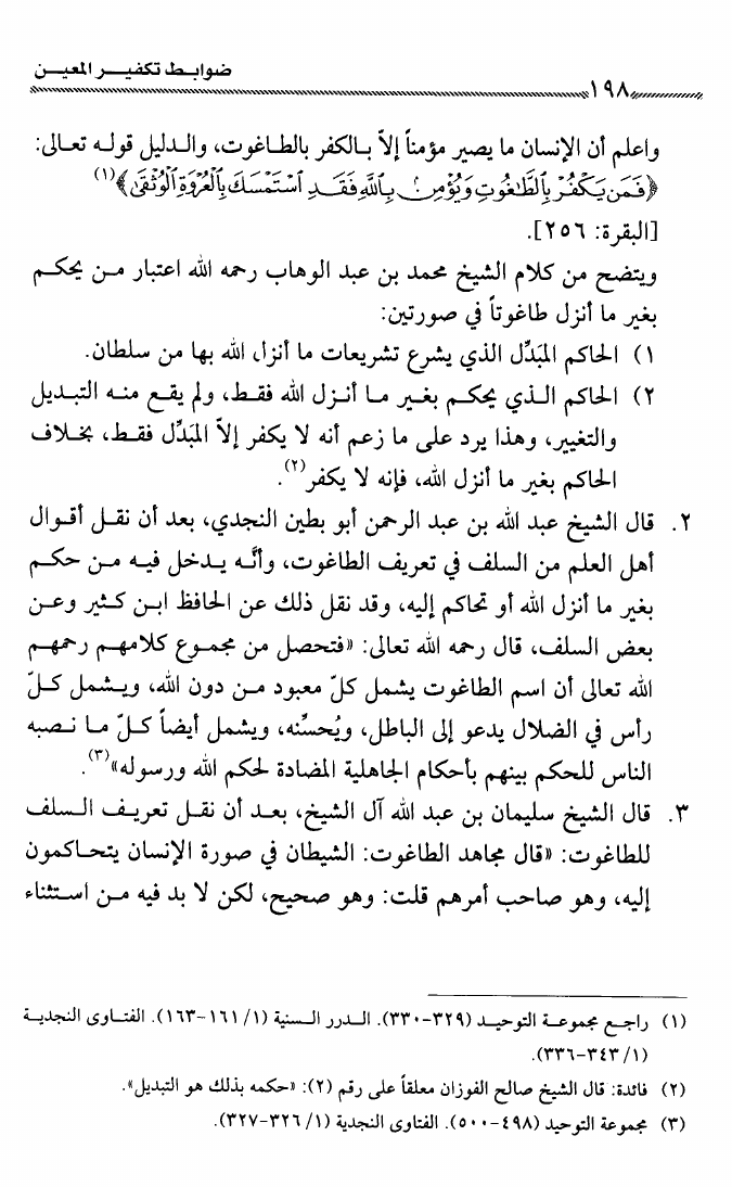 نام کتاب : ضوابط تكفير المعين عند شيخي الإسلام ابن تيمية وابن عبد الوهاب وعلماء الدعوة الإصلاحية نویسنده : راشد بن أبي العلا الراشد أبو العلا جلد : 1 صفحه : 198