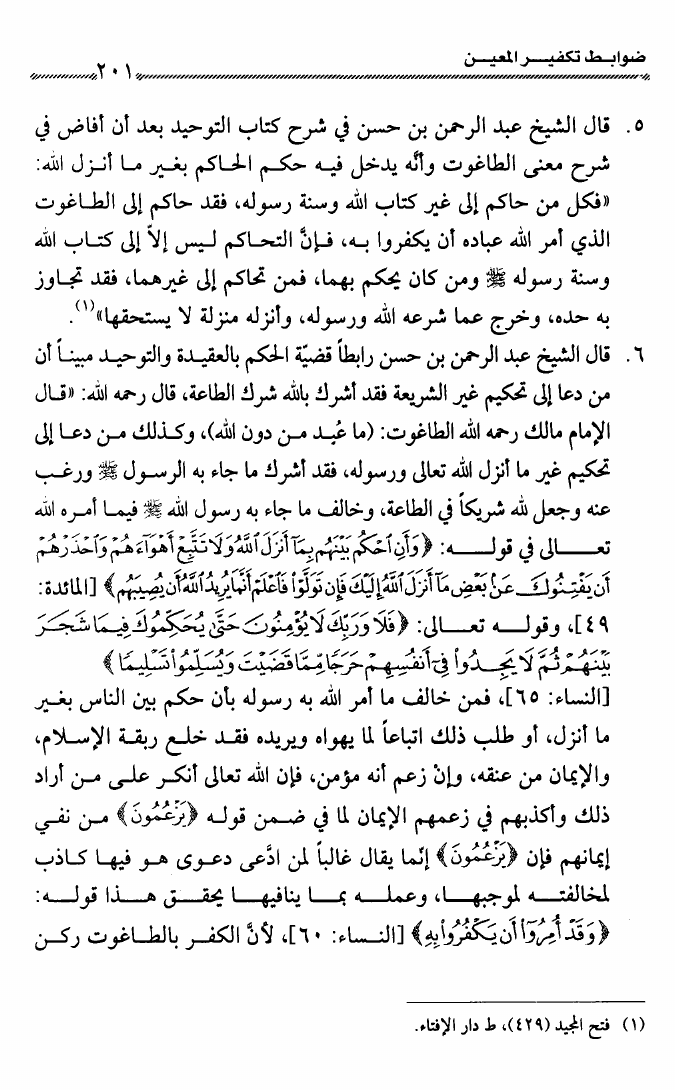 نام کتاب : ضوابط تكفير المعين عند شيخي الإسلام ابن تيمية وابن عبد الوهاب وعلماء الدعوة الإصلاحية نویسنده : راشد بن أبي العلا الراشد أبو العلا جلد : 1 صفحه : 201