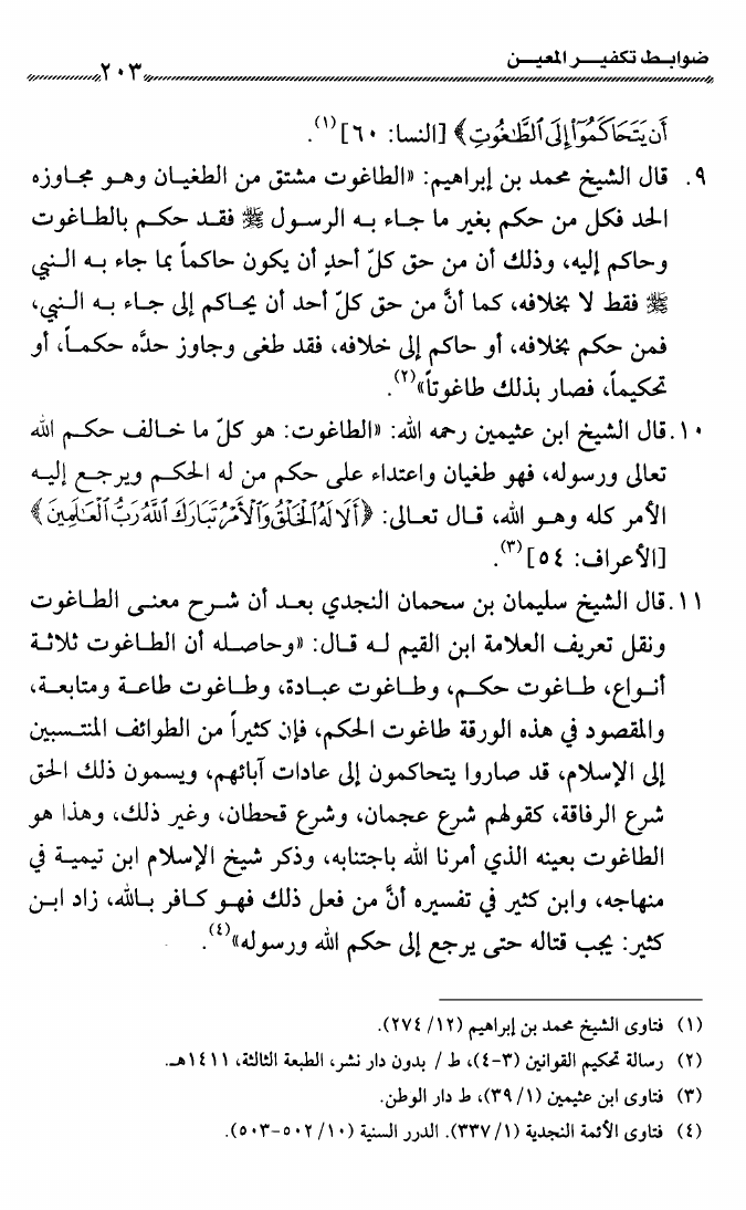 نام کتاب : ضوابط تكفير المعين عند شيخي الإسلام ابن تيمية وابن عبد الوهاب وعلماء الدعوة الإصلاحية نویسنده : راشد بن أبي العلا الراشد أبو العلا جلد : 1 صفحه : 203