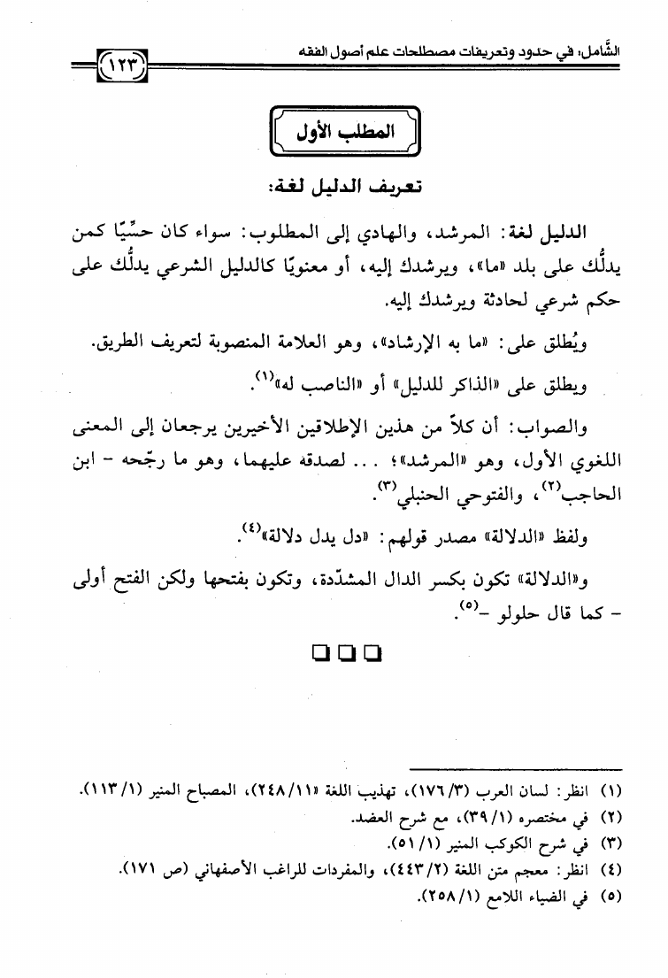 نام کتاب : الشامل في حدود وتعريفات مصطلحات علم أصول الفقه وشرح صحيحها وبيان ضعيفها والفروق بين المتشابه منها دراسة تأصيلية استقرائية نقدية نویسنده : عبد الكريم بن علي بن محمد النملة جلد : 1 صفحه : 123