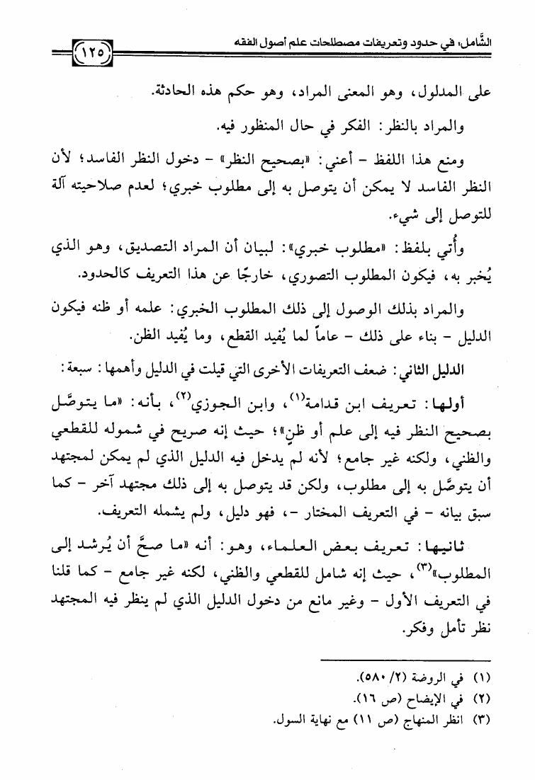 نام کتاب : الشامل في حدود وتعريفات مصطلحات علم أصول الفقه وشرح صحيحها وبيان ضعيفها والفروق بين المتشابه منها دراسة تأصيلية استقرائية نقدية نویسنده : عبد الكريم بن علي بن محمد النملة جلد : 1 صفحه : 125