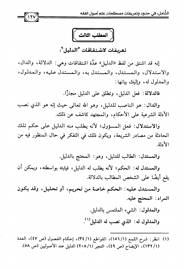 نام کتاب : الشامل في حدود وتعريفات مصطلحات علم أصول الفقه وشرح صحيحها وبيان ضعيفها والفروق بين المتشابه منها دراسة تأصيلية استقرائية نقدية نویسنده : عبد الكريم بن علي بن محمد النملة جلد : 1 صفحه : 127