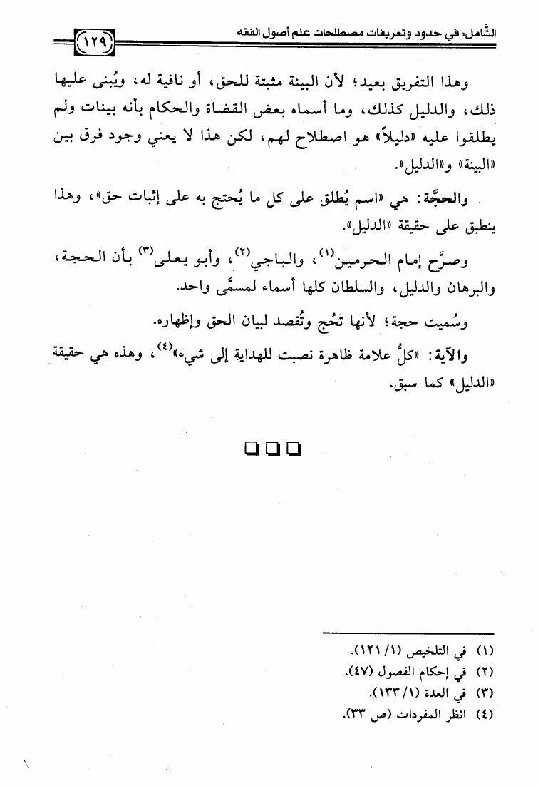 نام کتاب : الشامل في حدود وتعريفات مصطلحات علم أصول الفقه وشرح صحيحها وبيان ضعيفها والفروق بين المتشابه منها دراسة تأصيلية استقرائية نقدية نویسنده : عبد الكريم بن علي بن محمد النملة جلد : 1 صفحه : 129