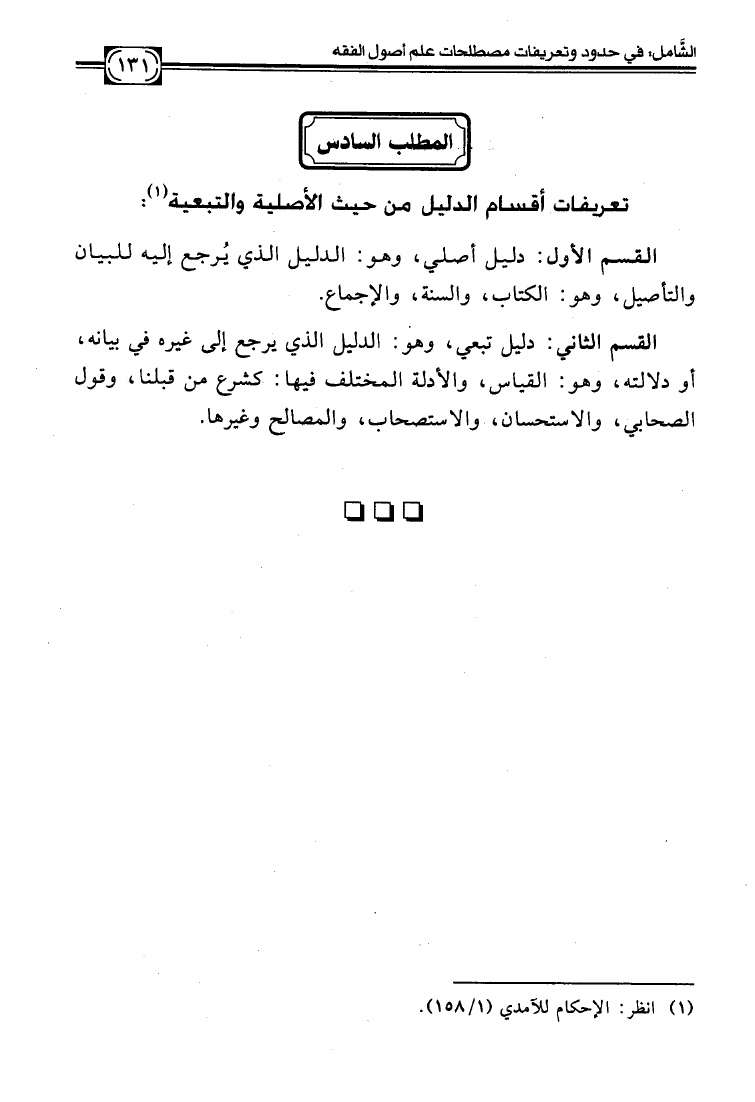 نام کتاب : الشامل في حدود وتعريفات مصطلحات علم أصول الفقه وشرح صحيحها وبيان ضعيفها والفروق بين المتشابه منها دراسة تأصيلية استقرائية نقدية نویسنده : عبد الكريم بن علي بن محمد النملة جلد : 1 صفحه : 131