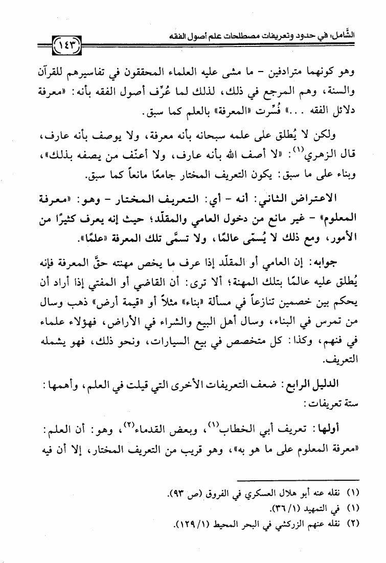 نام کتاب : الشامل في حدود وتعريفات مصطلحات علم أصول الفقه وشرح صحيحها وبيان ضعيفها والفروق بين المتشابه منها دراسة تأصيلية استقرائية نقدية نویسنده : عبد الكريم بن علي بن محمد النملة جلد : 1 صفحه : 143