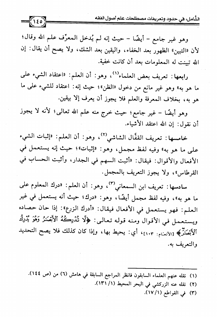 نام کتاب : الشامل في حدود وتعريفات مصطلحات علم أصول الفقه وشرح صحيحها وبيان ضعيفها والفروق بين المتشابه منها دراسة تأصيلية استقرائية نقدية نویسنده : عبد الكريم بن علي بن محمد النملة جلد : 1 صفحه : 145