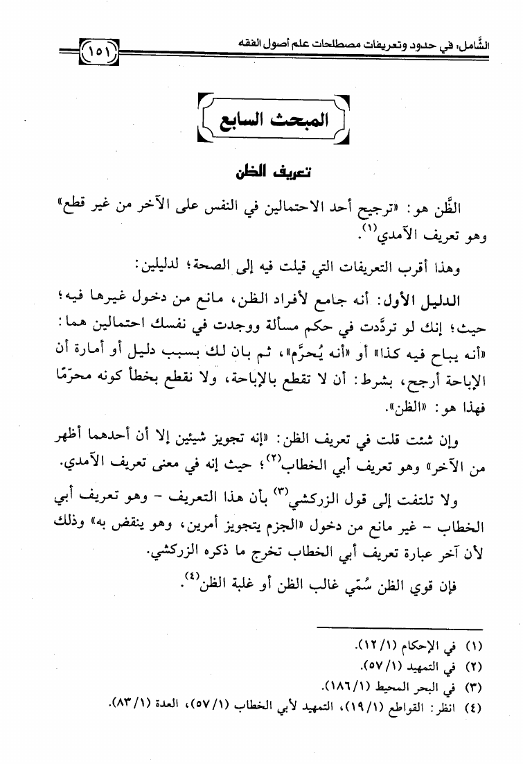 نام کتاب : الشامل في حدود وتعريفات مصطلحات علم أصول الفقه وشرح صحيحها وبيان ضعيفها والفروق بين المتشابه منها دراسة تأصيلية استقرائية نقدية نویسنده : عبد الكريم بن علي بن محمد النملة جلد : 1 صفحه : 151