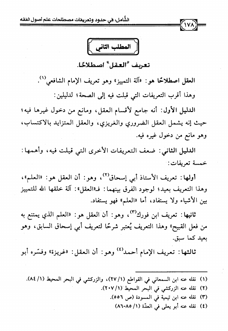 نام کتاب : الشامل في حدود وتعريفات مصطلحات علم أصول الفقه وشرح صحيحها وبيان ضعيفها والفروق بين المتشابه منها دراسة تأصيلية استقرائية نقدية نویسنده : عبد الكريم بن علي بن محمد النملة جلد : 1 صفحه : 178