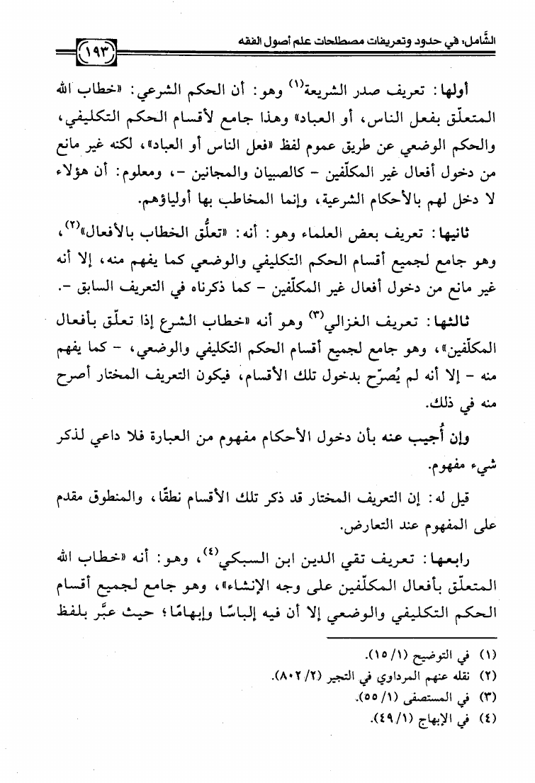 نام کتاب : الشامل في حدود وتعريفات مصطلحات علم أصول الفقه وشرح صحيحها وبيان ضعيفها والفروق بين المتشابه منها دراسة تأصيلية استقرائية نقدية نویسنده : عبد الكريم بن علي بن محمد النملة جلد : 1 صفحه : 193