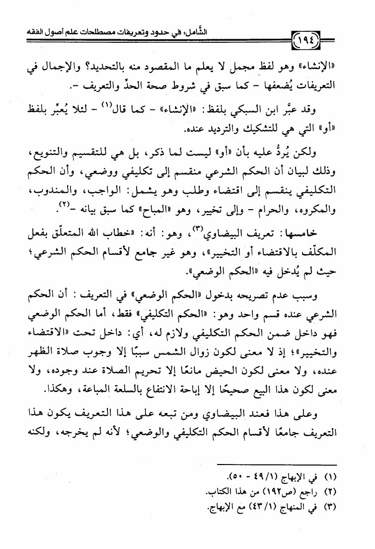 نام کتاب : الشامل في حدود وتعريفات مصطلحات علم أصول الفقه وشرح صحيحها وبيان ضعيفها والفروق بين المتشابه منها دراسة تأصيلية استقرائية نقدية نویسنده : عبد الكريم بن علي بن محمد النملة جلد : 1 صفحه : 194