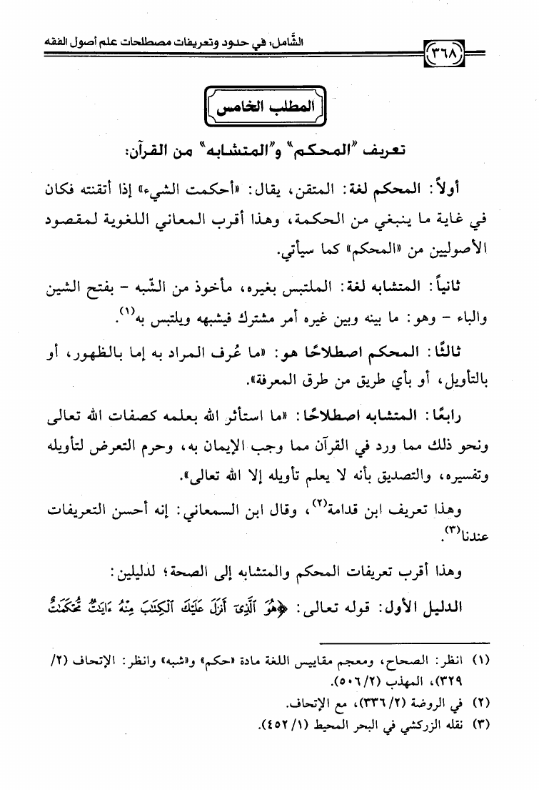 نام کتاب : الشامل في حدود وتعريفات مصطلحات علم أصول الفقه وشرح صحيحها وبيان ضعيفها والفروق بين المتشابه منها دراسة تأصيلية استقرائية نقدية نویسنده : عبد الكريم بن علي بن محمد النملة جلد : 1 صفحه : 368