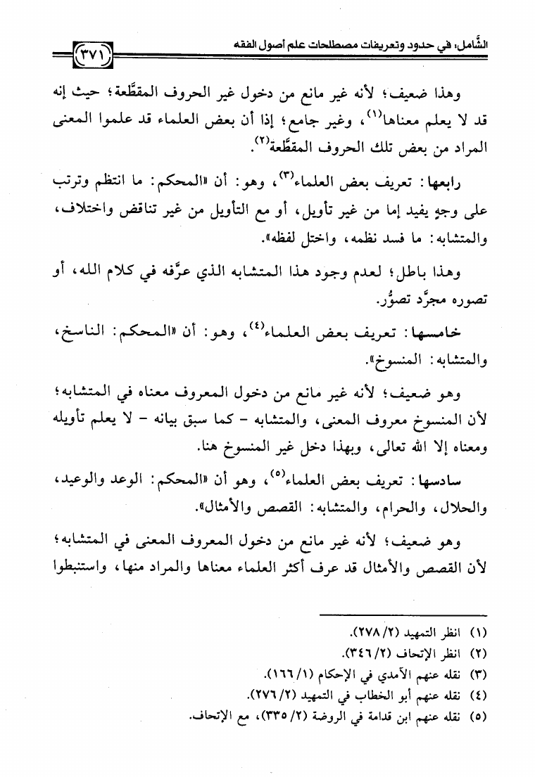 نام کتاب : الشامل في حدود وتعريفات مصطلحات علم أصول الفقه وشرح صحيحها وبيان ضعيفها والفروق بين المتشابه منها دراسة تأصيلية استقرائية نقدية نویسنده : عبد الكريم بن علي بن محمد النملة جلد : 1 صفحه : 371