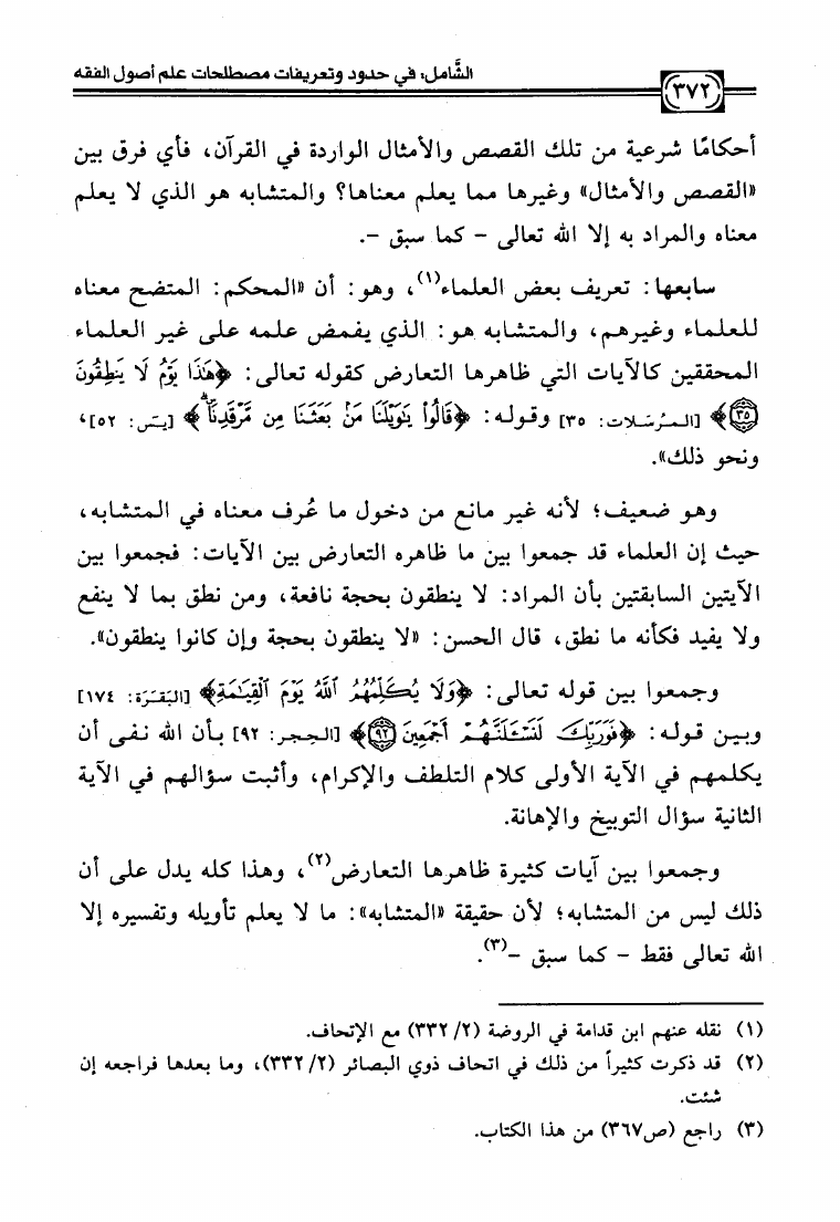 نام کتاب : الشامل في حدود وتعريفات مصطلحات علم أصول الفقه وشرح صحيحها وبيان ضعيفها والفروق بين المتشابه منها دراسة تأصيلية استقرائية نقدية نویسنده : عبد الكريم بن علي بن محمد النملة جلد : 1 صفحه : 372