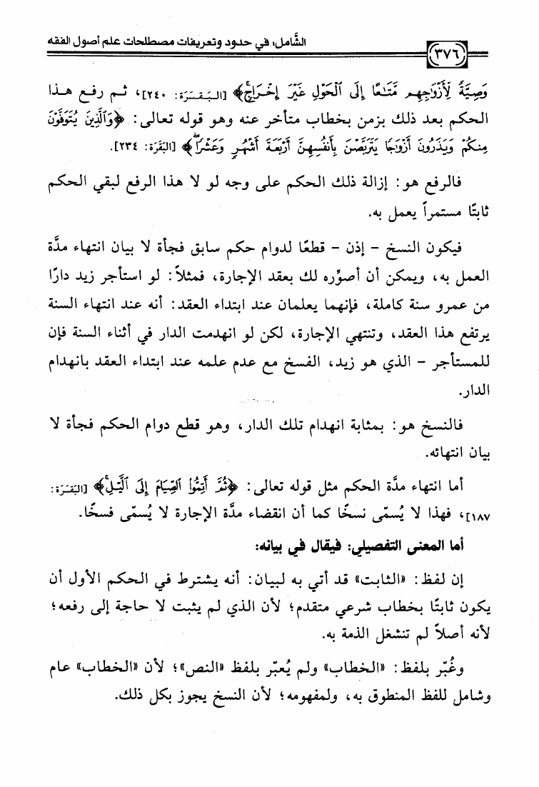 نام کتاب : الشامل في حدود وتعريفات مصطلحات علم أصول الفقه وشرح صحيحها وبيان ضعيفها والفروق بين المتشابه منها دراسة تأصيلية استقرائية نقدية نویسنده : عبد الكريم بن علي بن محمد النملة جلد : 1 صفحه : 376