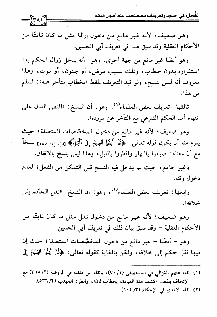 نام کتاب : الشامل في حدود وتعريفات مصطلحات علم أصول الفقه وشرح صحيحها وبيان ضعيفها والفروق بين المتشابه منها دراسة تأصيلية استقرائية نقدية نویسنده : عبد الكريم بن علي بن محمد النملة جلد : 1 صفحه : 381