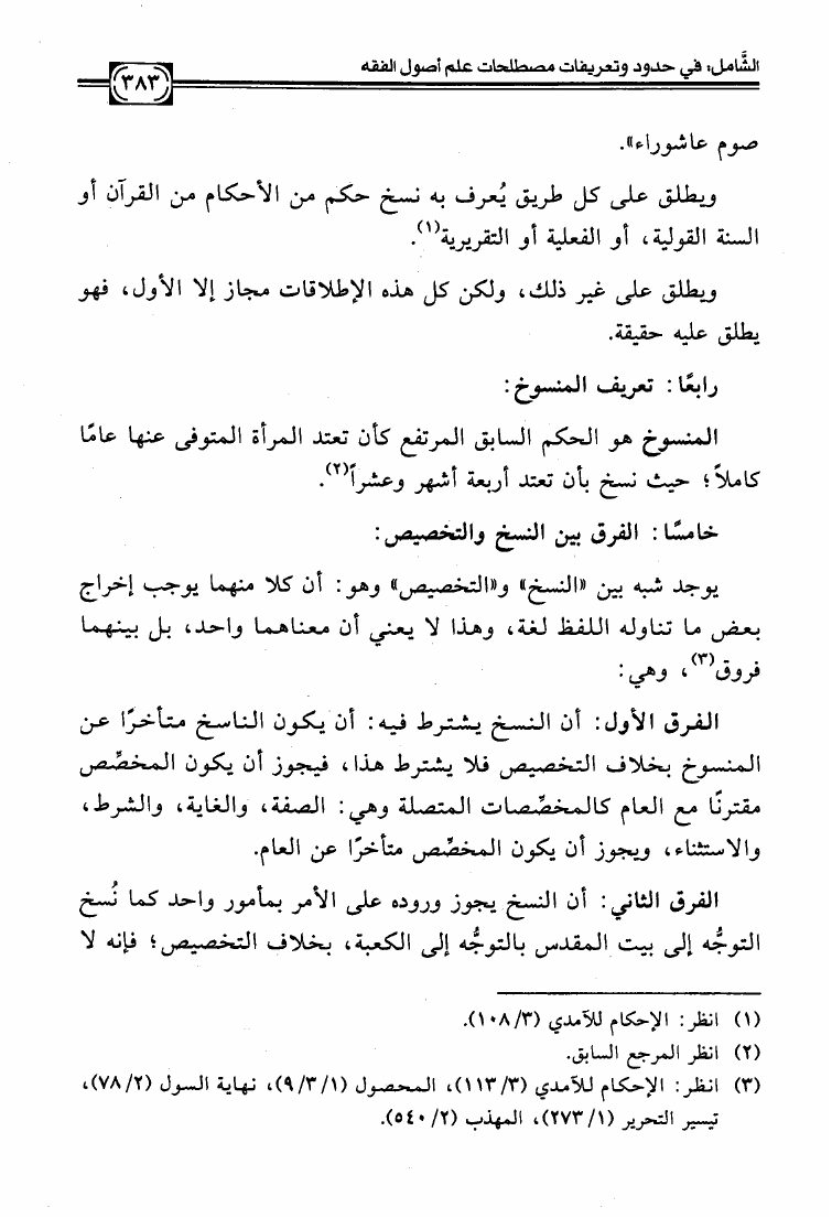 نام کتاب : الشامل في حدود وتعريفات مصطلحات علم أصول الفقه وشرح صحيحها وبيان ضعيفها والفروق بين المتشابه منها دراسة تأصيلية استقرائية نقدية نویسنده : عبد الكريم بن علي بن محمد النملة جلد : 1 صفحه : 383