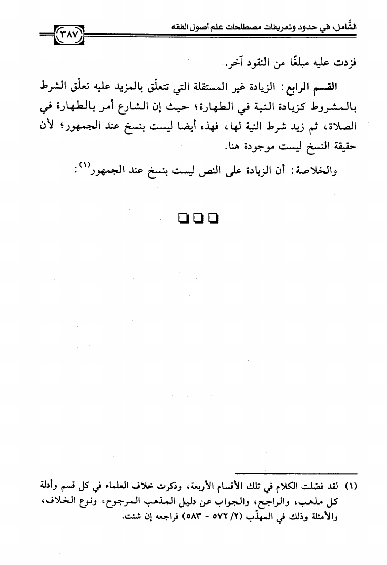 نام کتاب : الشامل في حدود وتعريفات مصطلحات علم أصول الفقه وشرح صحيحها وبيان ضعيفها والفروق بين المتشابه منها دراسة تأصيلية استقرائية نقدية نویسنده : عبد الكريم بن علي بن محمد النملة جلد : 1 صفحه : 387