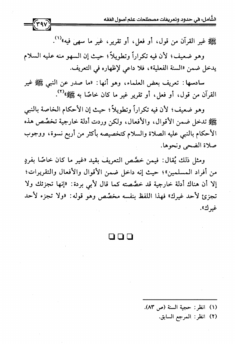 نام کتاب : الشامل في حدود وتعريفات مصطلحات علم أصول الفقه وشرح صحيحها وبيان ضعيفها والفروق بين المتشابه منها دراسة تأصيلية استقرائية نقدية نویسنده : عبد الكريم بن علي بن محمد النملة جلد : 1 صفحه : 397