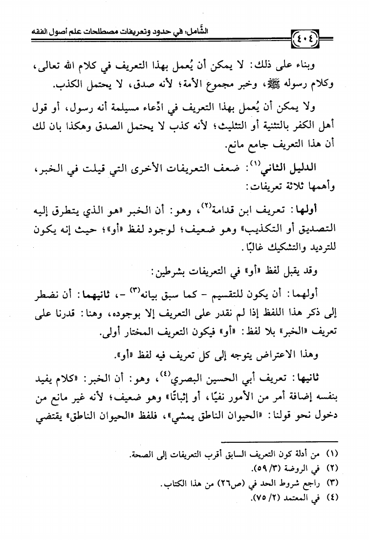 نام کتاب : الشامل في حدود وتعريفات مصطلحات علم أصول الفقه وشرح صحيحها وبيان ضعيفها والفروق بين المتشابه منها دراسة تأصيلية استقرائية نقدية نویسنده : عبد الكريم بن علي بن محمد النملة جلد : 1 صفحه : 404