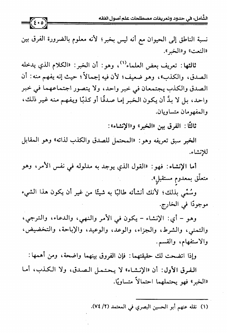 نام کتاب : الشامل في حدود وتعريفات مصطلحات علم أصول الفقه وشرح صحيحها وبيان ضعيفها والفروق بين المتشابه منها دراسة تأصيلية استقرائية نقدية نویسنده : عبد الكريم بن علي بن محمد النملة جلد : 1 صفحه : 405