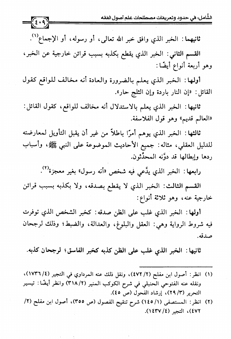 نام کتاب : الشامل في حدود وتعريفات مصطلحات علم أصول الفقه وشرح صحيحها وبيان ضعيفها والفروق بين المتشابه منها دراسة تأصيلية استقرائية نقدية نویسنده : عبد الكريم بن علي بن محمد النملة جلد : 1 صفحه : 409