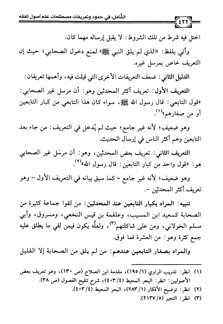 نام کتاب : الشامل في حدود وتعريفات مصطلحات علم أصول الفقه وشرح صحيحها وبيان ضعيفها والفروق بين المتشابه منها دراسة تأصيلية استقرائية نقدية نویسنده : عبد الكريم بن علي بن محمد النملة جلد : 1 صفحه : 422