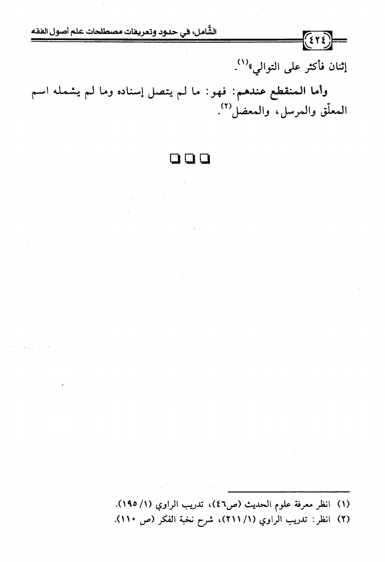 نام کتاب : الشامل في حدود وتعريفات مصطلحات علم أصول الفقه وشرح صحيحها وبيان ضعيفها والفروق بين المتشابه منها دراسة تأصيلية استقرائية نقدية نویسنده : عبد الكريم بن علي بن محمد النملة جلد : 1 صفحه : 424