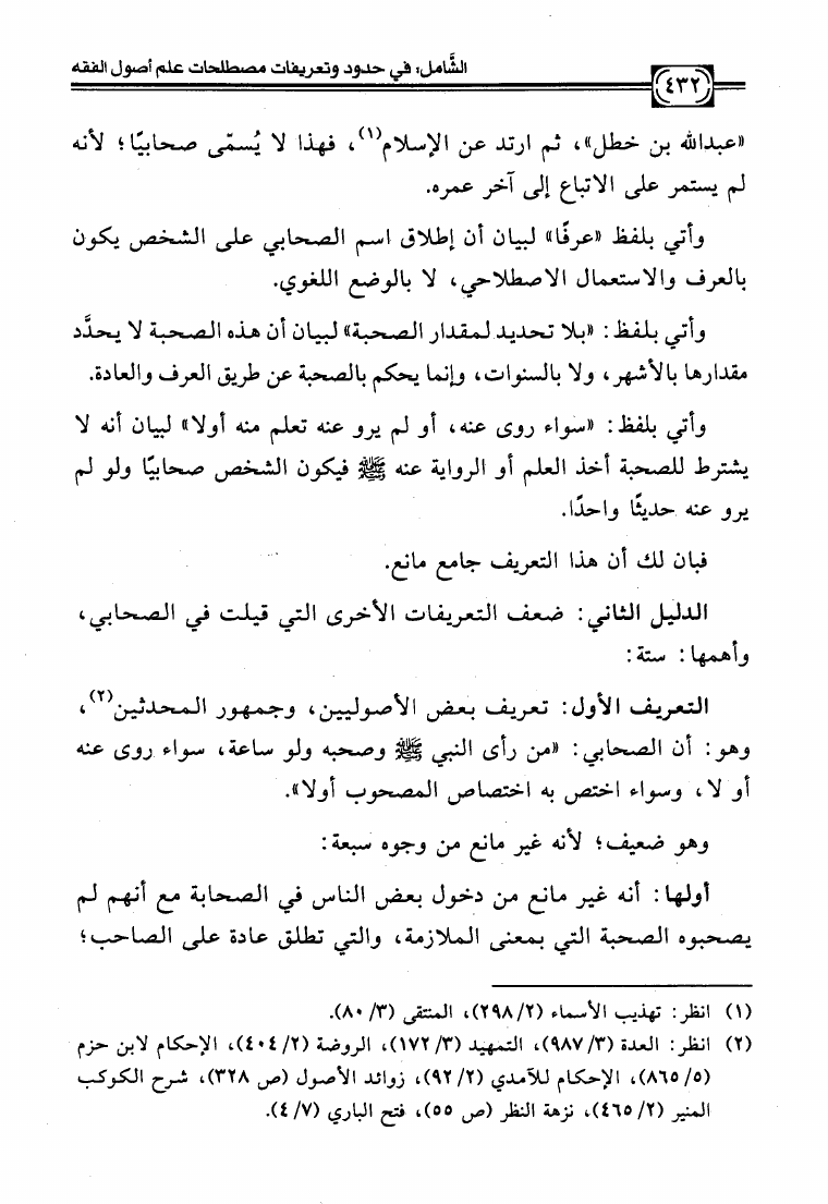 نام کتاب : الشامل في حدود وتعريفات مصطلحات علم أصول الفقه وشرح صحيحها وبيان ضعيفها والفروق بين المتشابه منها دراسة تأصيلية استقرائية نقدية نویسنده : عبد الكريم بن علي بن محمد النملة جلد : 1 صفحه : 432