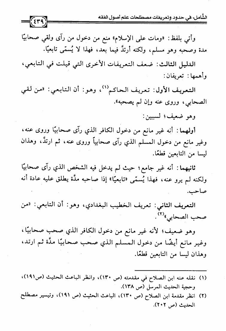 نام کتاب : الشامل في حدود وتعريفات مصطلحات علم أصول الفقه وشرح صحيحها وبيان ضعيفها والفروق بين المتشابه منها دراسة تأصيلية استقرائية نقدية نویسنده : عبد الكريم بن علي بن محمد النملة جلد : 1 صفحه : 439